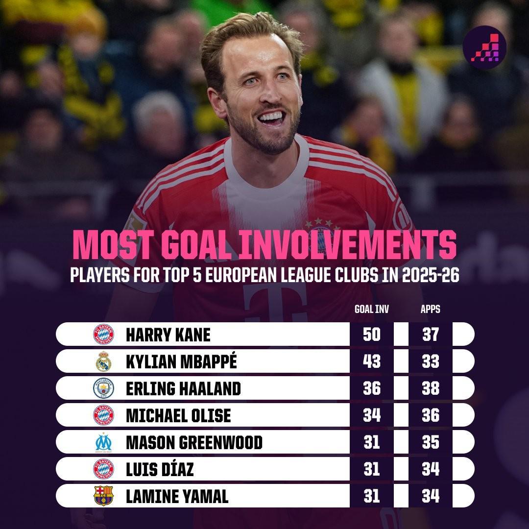 据统计,凯恩是本赛季第一位直接参与50球的五大联赛球员。